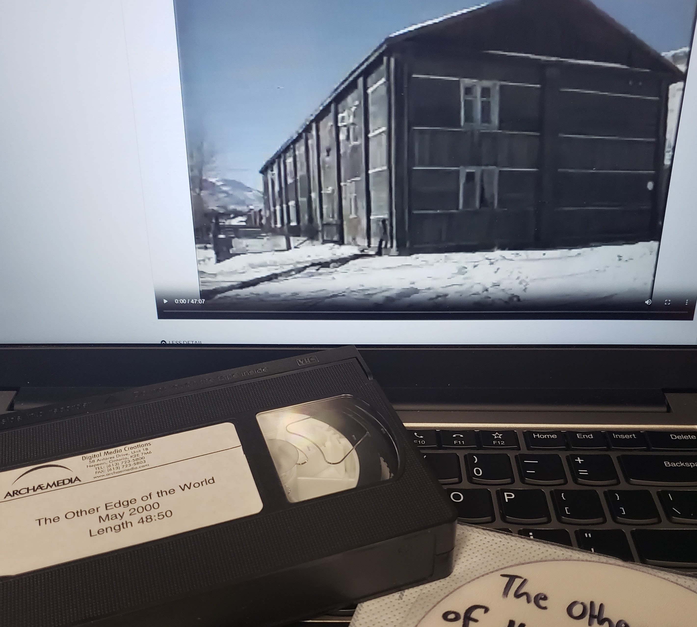 The documentary The Other Edge of the World is shown on a laptop screen, next to a VHS tape and DVD copy of the film. Photo credit: ICC Canada Archives.